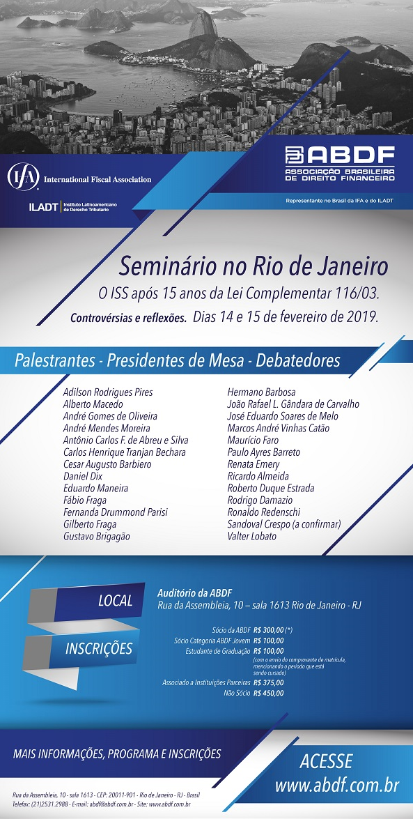 Os sócios do SCMD André Mendes e Valter Lobato estão entre os especialistas convidados para o Seminário “O ISS após 15 anos da Lei Complementar 116/03. Controvérsias e Reflexões”.