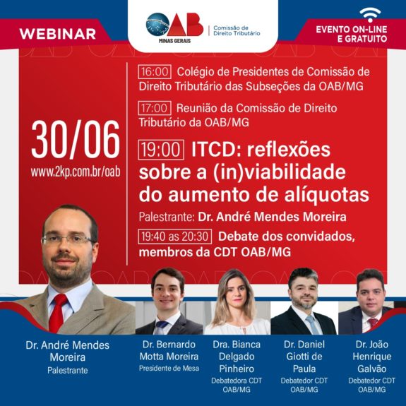 O sócio-conselheiro do Sacha Calmon – Misabel Derzi Consultores e Advogados (SCMD) André Mendes Moreira será o palestrante do Webinar da Comissão de Direito Tributário da OAB/MG, na próxima terça-feira (30/6).