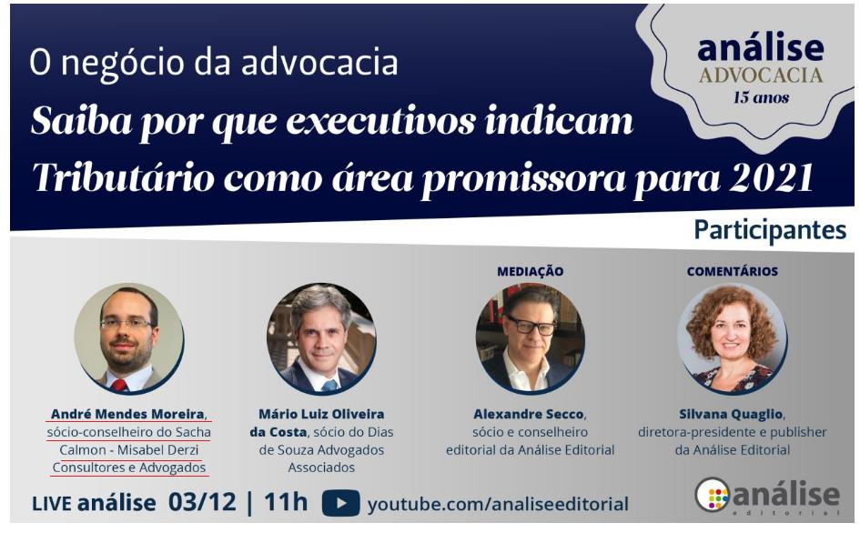 O sócio-conselheiro do SCMD André Mendes Moreira está entre os convidados da Live Análise desta quinta-feira (3/12), sobre os motivos pelos quais a área de Direito Tributário é uma das mais promissoras para o ano de 2021, de acordo com executivos jurídicos das maiores empresas do Brasil.