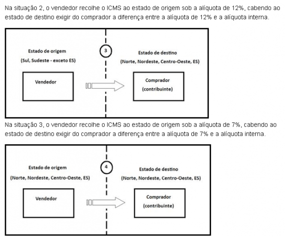 Na situação 4, o vendedor recolhe o ICMS ao estado de origem sob a alíquota de 12%, cabendo ao estado de destino exigir do comprador a diferença entre a alíquota de 12% e a alíquota interna.