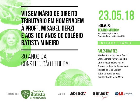 Tendo como tema central os 30 anos da Constituição Federal, o VII Seminário de Direito Tributário em Homenagem à Professora Misabel Derzi também contará com a presença dos professores Sacha Calmon e Valter Lobato.