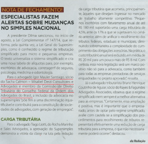 O sócio Igor Mauler Santiago foi ouvido pela Revista Visão Jurídica acerca das reformas ocorridas na Lei Geral do Supersimples, proporcionadas pela Lei Complementar 147/14.