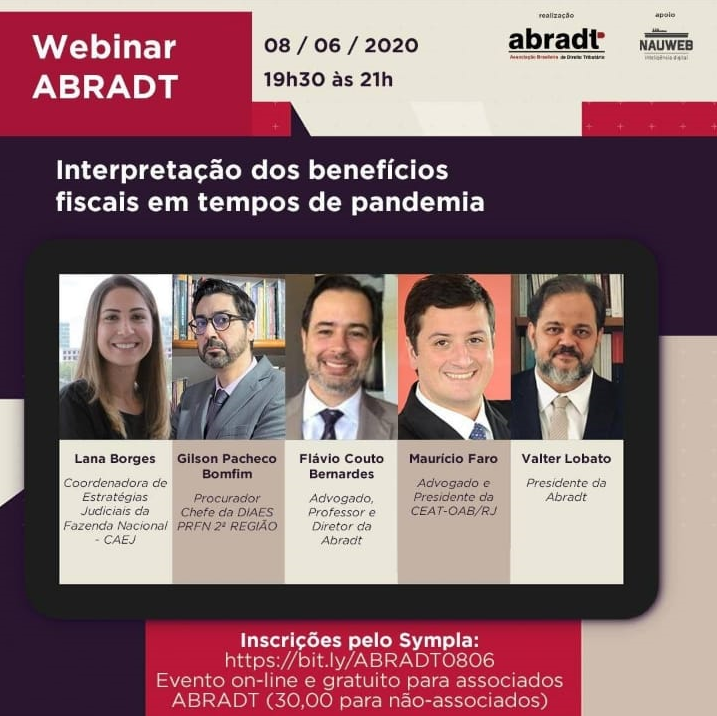 O evento on-line será realizado das 19h30 às 21h e abordará a “Interpretação dos benefícios fiscais em tempos de pandemia”.