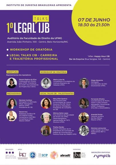 Migalhíssimas: Instituto de Juristas Brasileiras promove hoje, em BH, o “1º Legal Talks IJB”, workshop de oratória seguido de palestras sobre carreira e trajetória profissional voltado para juristas do sexo feminino. Misabel Derzi (Sacha Calmon – Misabel Derzi Consultores e Advogados) é a presidente de honra do Instituto, que visa criar uma rede de profissionais com o objetivo de aprofundar o conhecimento técnico-científico das várias áreas do direito e criar um espaço para desenvolver ações e projetos que valorizem o trabalho das juristas.