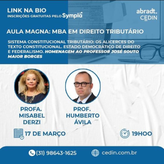 A professora Misabel Derzi ministrará Aula Magna no MBA em Direito Tributário do Centro de Estudos em Direito e Negócios (CEDIN), no dia 17 de março, às 19h.