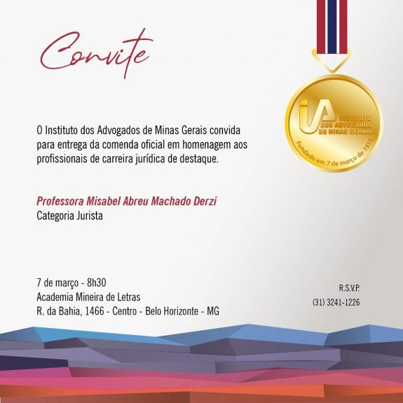Sócia-fundadora do SCMD, a professora Misabel Derzi receberá mais uma importante homenagem. Trata-se da comenda oficial em homenagem aos profissionais de carreira jurídica de destaque, concedida pelo Instituto dos Advogados de Minas Gerais (IAMG).