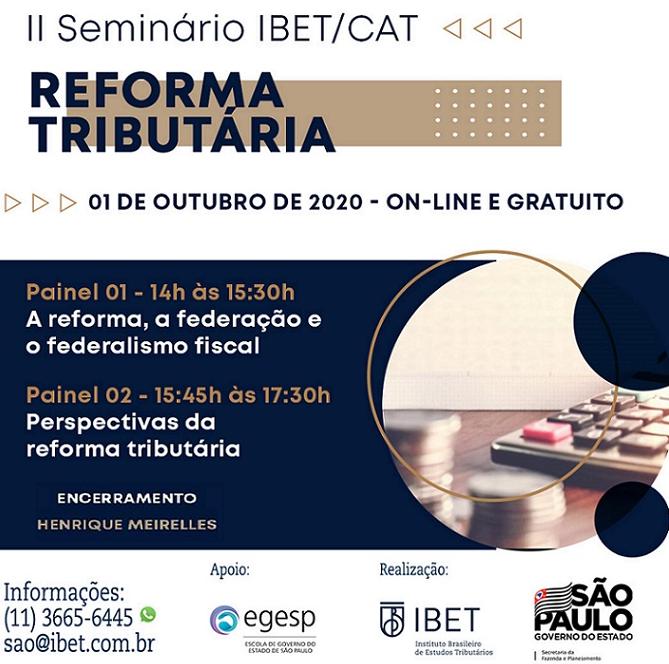 O Instituto Brasileiro de Estudos Tributários (IBET), em conjunto com a Coordenadoria de Administração Tributária (CAT) da Secretaria da Fazenda e Planejamento do Estado de São Paulo e a Escola de Governo do Estado de São Paulo (Egesp), realizará no próximo dia 1º (quinta-feira), das 14 às 17h30, o II Seminário IBET/CAT, que contará com a participação de especialistas que irão expor análises no âmbito da Reforma Tributária.