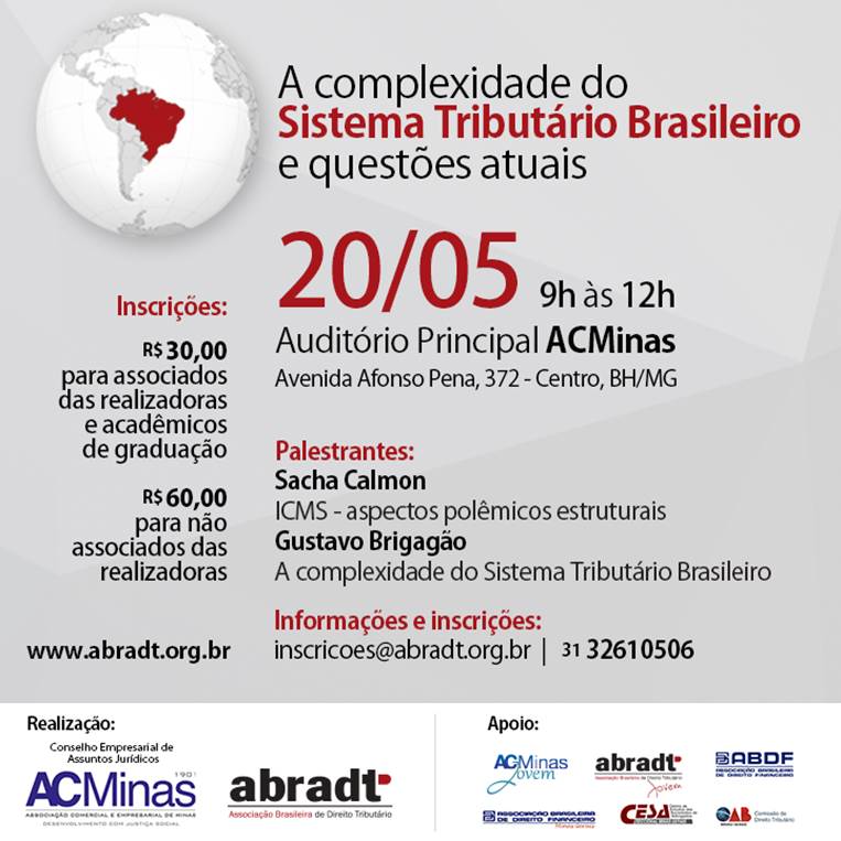 O professor Sacha Calmon foi convidado para ser um dos dois palestrantes do Seminário “A complexidade do Sistema Tributário Brasileiro e questões atuais”, promovido pela Abradt e o Conselho Empresarial de Assuntos Jurídicos da ACMinas.