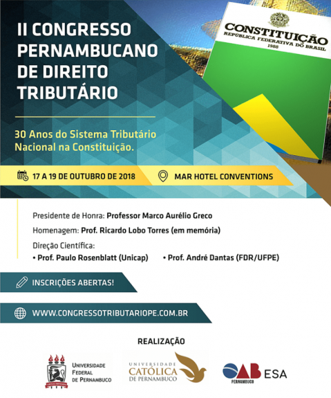 Promovido pela Faculdade de Direito do Recife da UFPE, pelo Centro de Ciências Jurídicas da Universidade Católica de Pernambuco (Unicap) e pela Escola Superior da Advocacia da OAB-PE, o II Congresso Pernambucano de Direito Tributário tem o apoio da Associação Brasileira de Direito Tributário (ABRADT).
