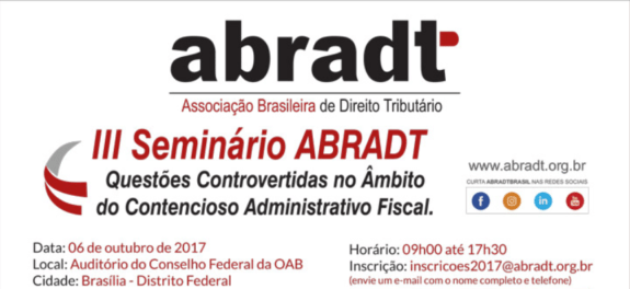 O Sacha Calmon – Misabel Derzi Consultores e Advogados (SCMD) apoia o III Seminário Questões Controvertidas no Âmbito do Contencioso Administrativo Fiscal, promovido pela Associação Brasileira de Direito Tributário (ABRADT). O evento será realizado em 6 de outubro, no auditório do Conselho Federal da OAB, em Brasília, das 9h às 17h30.