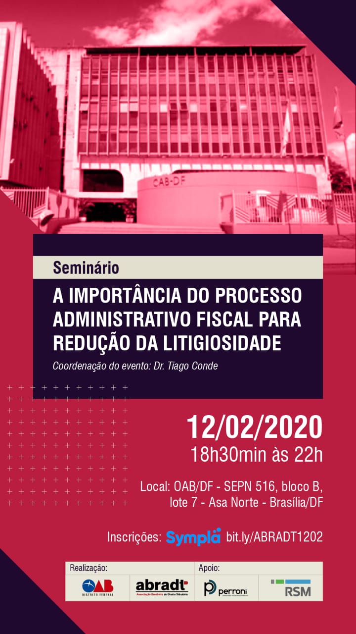 O Seminário tem o apoio da OAB-DF e da Associação Brasileira de Direito Tributário (ABRADT), e também trará painéis com os temas: