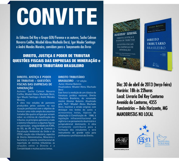 Os professores Sacha Calmon, Misabel Derzi, André Mendes Moreira e Igor Mauler Santiago lançam, na próxima terça-feira, o livro “Direito, Justiça e Poder de Tributar Questões Fiscais das Empresas de Mineração”.
