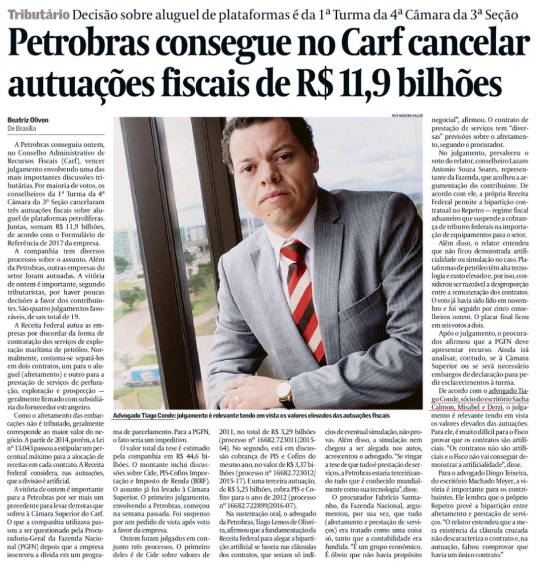 O sócio do SCMD Tiago Conde comentou, no Valor Econômico, decisão do Conselho Administrativo de Recursos Fiscais (Carf), relativa a autuações fiscais sobre aluguel de plataformas petrolíferas.