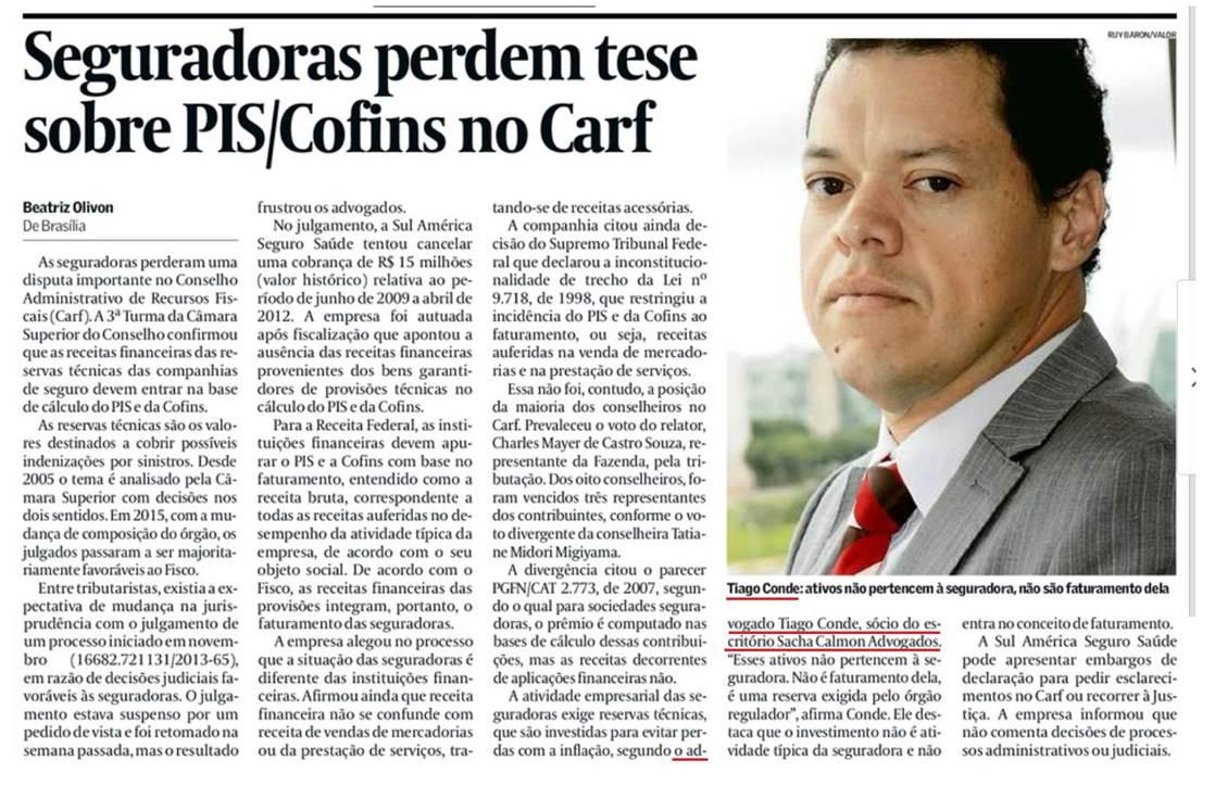 O Valor Econômico ouviu o sócio Tiago Conde Teixeira em reportagem sobre decisão do Carf que confirmou a inclusão, na base de cálculo do PIS e da Cofins, das receitas financeiras provenientes das reservas técnicas exigidas pelo órgão regulador das seguradoras.