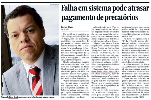 O sócio do SCMD Tiago Conde foi ouvido pelo Valor Econômico em matéria sobre possível atraso no pagamento de precatórios da União, ocasionado por falha tecnológica.