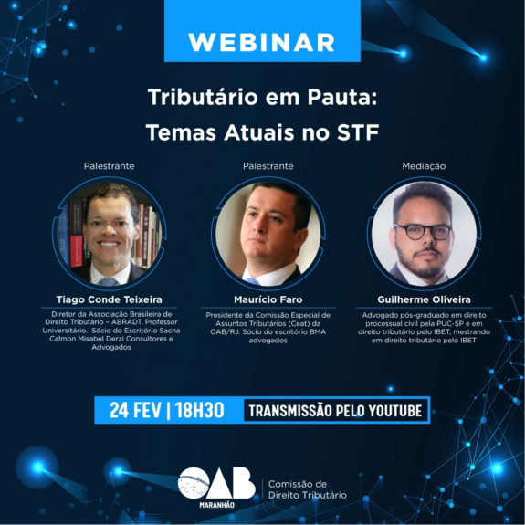 O sócio-conselheiro do SCMD Tiago Conde Teixeira será palestrante no Webinar Tributário em Pauta: Temas Atuais no STF, promovido pela Comissão de Direito Tributário da OAB do Maranhão.