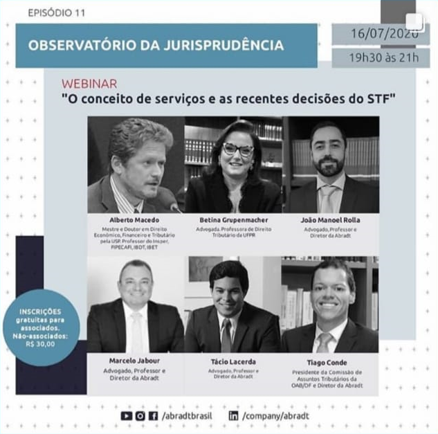 O Webinar “O conceito de serviços e as recentes decisões do STF” acontecerá nesta quinta-feira (16/7), das 19h30 às 21h.