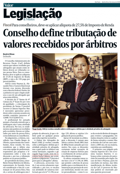 O Valor Econômico publicou a opinião do sócio do SCMD Tiago Conde Teixeira, em reportagem sobre definição do Conselho Administrativo de Recursos Fiscais (Carf) acerca da alíquota de Imposto de Renda na tributação dos valores recebidos por advogado que atua como árbitro.
