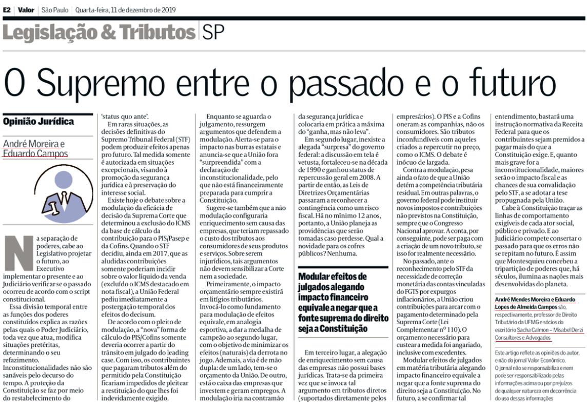 O Valor Econômico publicou artigo de autoria do sócio conselheiro do SCMD, André Mendes Moreira, em conjunto com Eduardo Lopes de Almeida Campos, intitulado “O Supremo entre o passado e o futuro”. O artigo aborda o debate em torno da exclusão do ICMS da base de cálculo da contribuição para o PIS/Pasep e da Cofins.