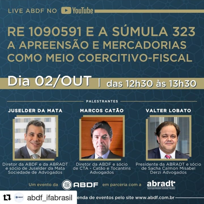 O sócio-conselheiro do Sacha Calmon – Misabel Derzi Consultores e Advogados Valter Lobato marcará presença na live ‘RE 1090591 e a Súmula 323. A apreensão de mercadorias como meio coercitivo-fiscal’, promovida pela Associação Brasileira de Direito Financeiro (ABDF).