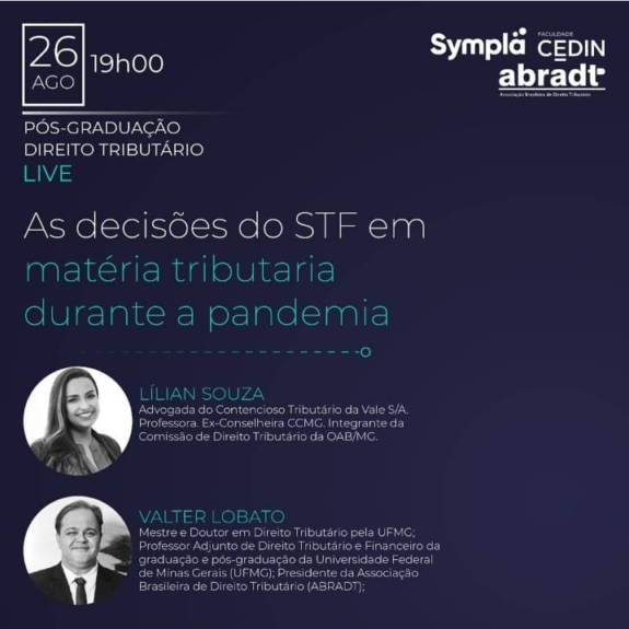 Sócio-conselheiro do Sacha Calmon – Misabel Derzi Consultores e Advogados, Valter Lobato irá ministrar aula sobre “As decisões do STF em matéria tributária durante a pandemia”, no curso de Pós-Graduação do Centro de Estudos em Direito e Negócios (Cedin), do qual é coordenador.