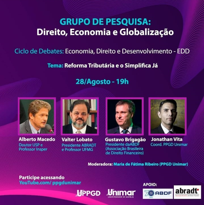 O evento on-line tem como tema “Reforma Tributária e o Simplifica Já” e será realizado nesta sexta-feira (28/8), a partir das 19h, no canal do PPGD Unimar no youtube: youtube.com/ppgdunimar.