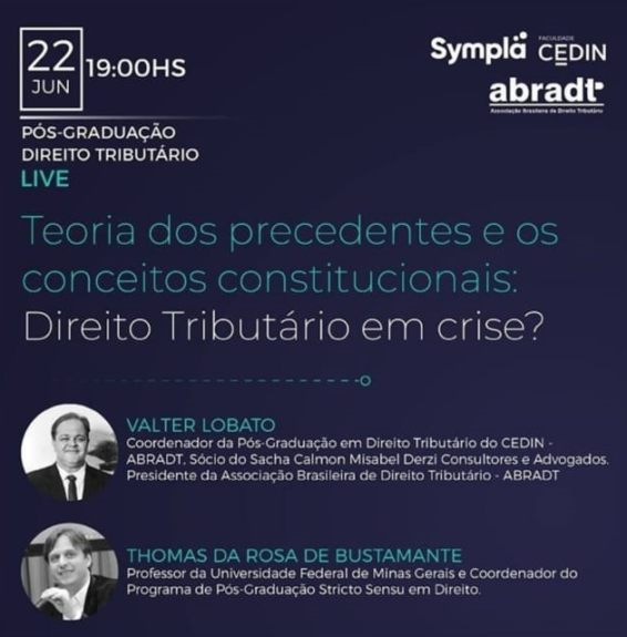 O sócio-conselheiro do Sacha Calmon – Misabel Derzi Consultores e Advogados (SCMD) Valter Lobato participará da live ‘Teoria dos precedentes e os conceitos constitucionais: Direito Tributário em crise?’, promovida pela Associação Brasileira de Direito Tributário (Abradt), entidade que preside, em parceria com o curso de Pós-Graduação do Centro de Estudos em Direito e Negócios (Cedin), do qual é coordenador.