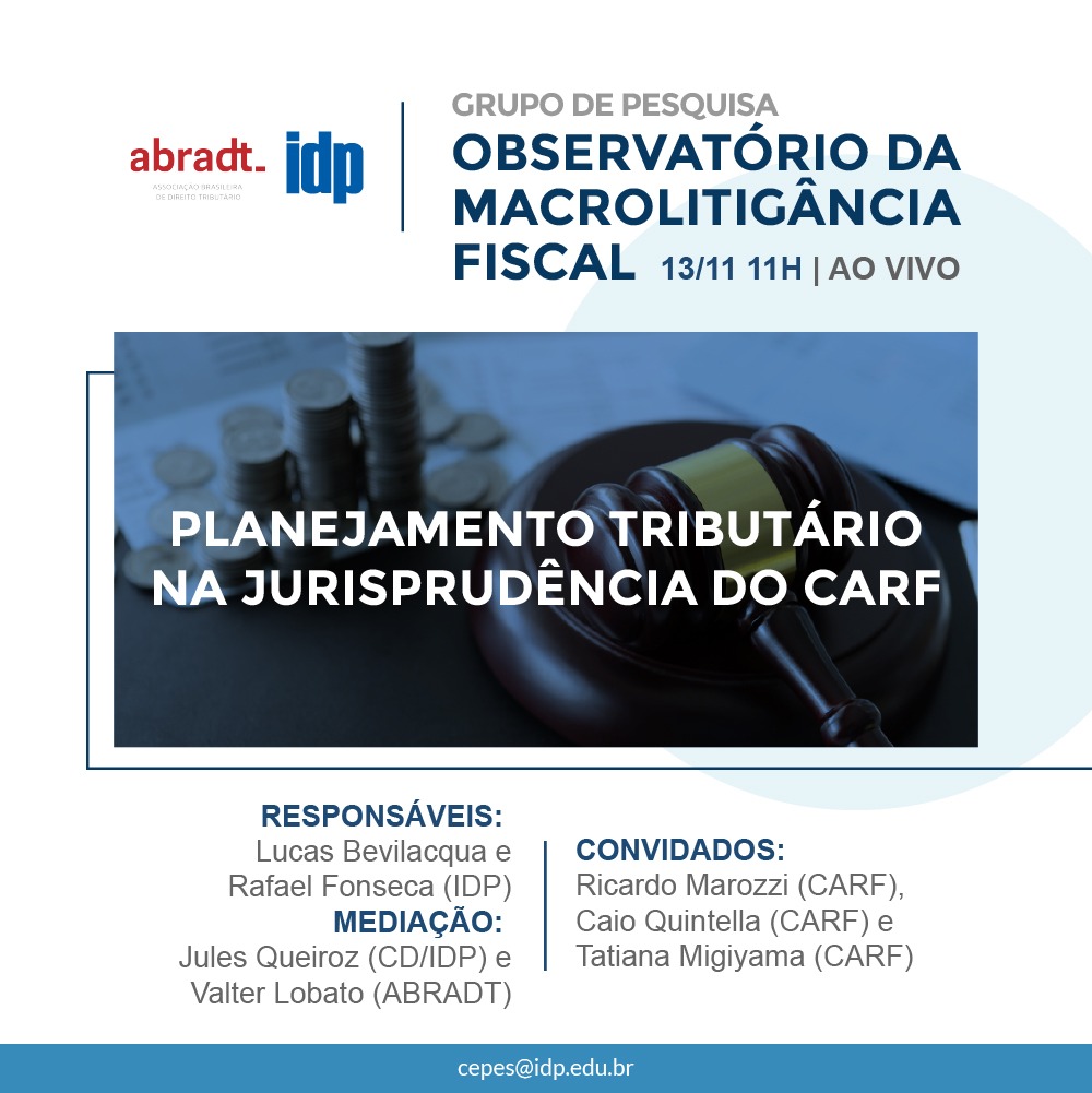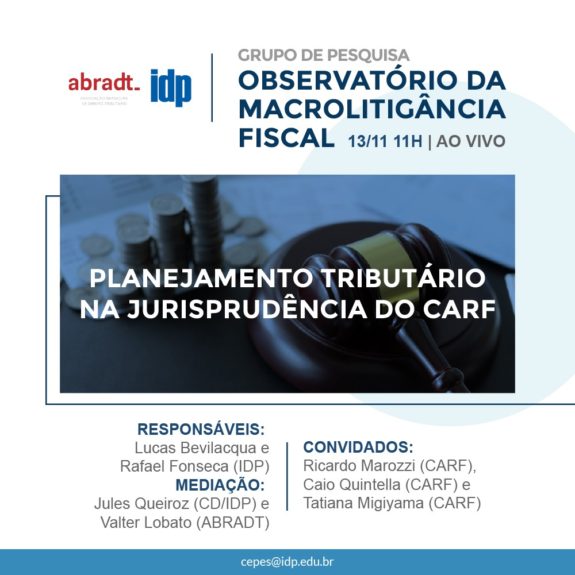 Promovido pelo Grupo de Pesquisa Observatório da Macrolitigância Fiscal do Instituto Brasiliense de Direito Público (IDP), com apoio da Associação Brasileira de Direito Tributário (Abradt), o evento será realizado no dia 13 de novembro, às 11h.