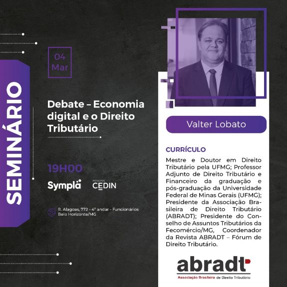 O sócio-conselheiro do SCMD Valter Lobato participará, na próxima quarta-feira (4/3), do Debate – Economia digital e o Direito Tributário, promovido pela Faculdade CEDIN (Centro de Estudos em Direito e Negócios). O evento será realizado às 19h, na Faculdade CEDIN (Rua Alagoas, 772), em Belo Horizonte.