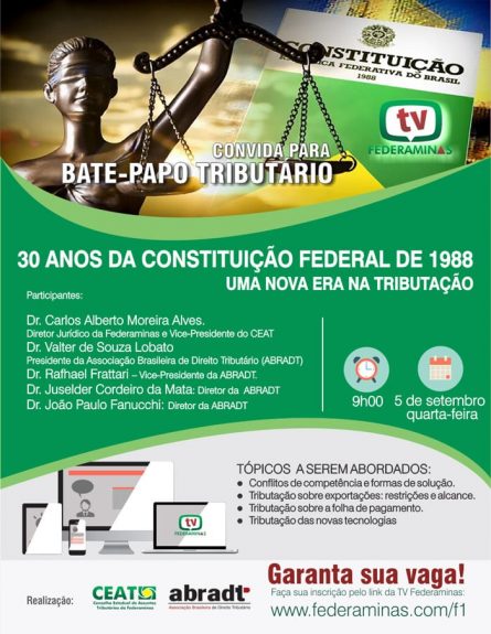 Apoiado pela Associação Brasileira de Direito Tributário (ABRADT), o evento será realizado nesta quarta-feira (5/9), às 9h, com o tema “30 anos da Constituição Federal de 1988 – Uma nova era na tributação”.