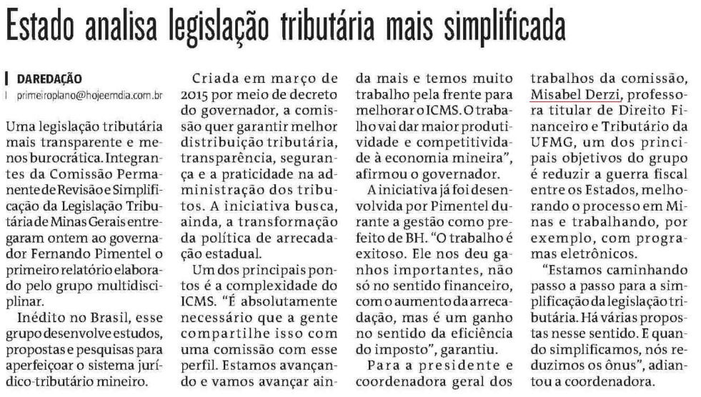 A Agência Minas Gerais divulgou o recebimento, pelo governador Fernando Pimentel, do primeiro relatório da Comissão Permanente de Revisão e Simplificação da Legislação Tributária do Estado de Minas Gerais, presidida pela professora Misabel Derzi. A informação foi repercutida por diversos veículos: