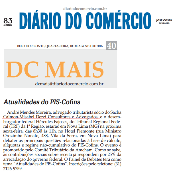 No dia 12/8, André Mendes Moreira, do escritório Sacha Calmon – Misabel Derzi Consultores e Advogados, e o desembargador federal Hércules Fajoses, do TRF da 1ª região, participam do painel de debates “Atualidades do Pis-Cofins”, para falar sobre as principais questões relacionadas à base de cálculo, alíquotas e regime não-cumulativo do Pis-Cofins, em Nova Lima/MG. Inscrições por e-mail ou telefone (31) 2126-9759. (Clique aqui)