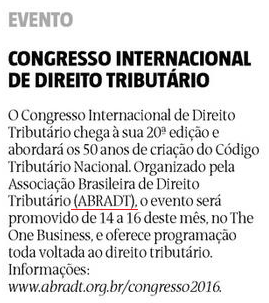 O Jornal Estado de Minas e o site da Revista Veja fizeram menções ao XX Congresso Internacional de Direito Tributário, promovido pela Associação Brasileira de Direito Tributário (Abradt).