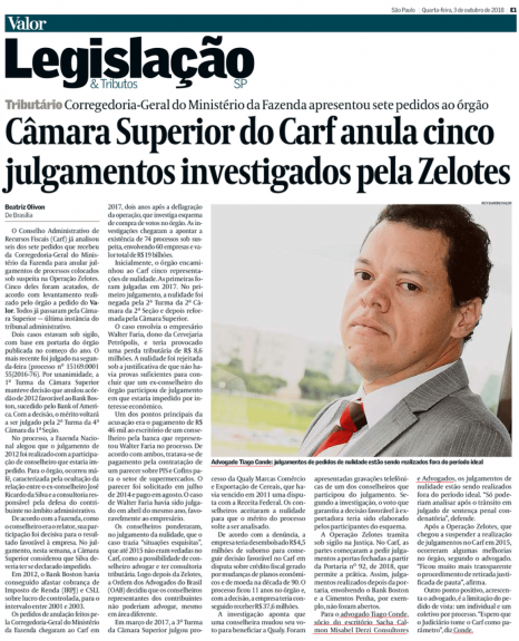 Em reportagem no caderno Legislação & Tributos, do Valor Econômico, o sócio do SCMD Tiago Conde comentou a anulação, pelo Carf, de julgamentos colocados sob suspeita na Operação Zelotes.